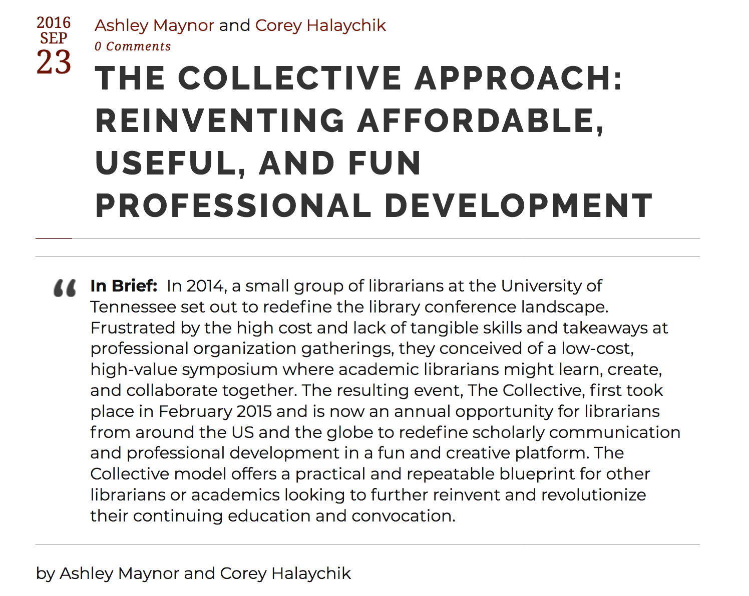 At the heart of The Library Collective’s efforts is a unique style of collaboration. The following column outlines how the Co-Founders and Co-Directors use and don’t use collaboration to create a professional development environment that embraces creativity, celebrates failure, and doesn’t cost a fortune.